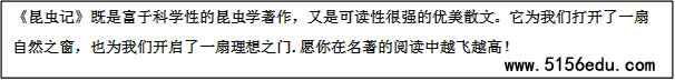 此题旨在考查学生对文章内容的理解。他是一个著名的法国昆虫学家、动物行为学家、作家。被世人称为“昆虫界的荷马”、“昆虫界的维吉尔”。法布尔出生于法国南部普罗旺斯的圣莱昂的一户农家。此后的几年间,法布尔是在离该村不远的马拉瓦尔祖父母家中度过的,当时年幼的他已被乡间的蝴蝶与萤火虫这些可爱的昆虫所吸引。那些东西虽然不是什么真正的“宝藏”,但它却激发了幼年法布尔心中的求知欲和创造力。法布尔作品中篇幅最长、地位最重要、最为世人所知的仍是《昆虫记》。这部作品不但展现了他科学观察研究方面的才能和文学才华,同时还向读者传达了他的人文精神以及对生命的无比热爱。据此理解作答。