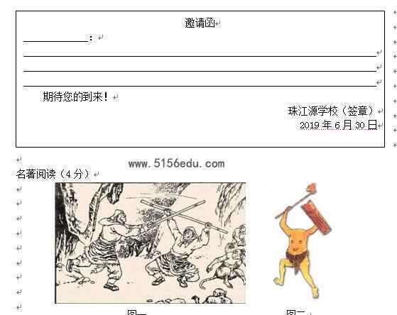 【解答】(1)根据题干对“爨”字的介绍,用正楷或行楷将其规范书写至指定的位置,书写时数出笔画数即可。 (2)本题要求写的是邀请函,格式题干已给出,按题干所给的信息,拟写正文即可。拟写时注意写清活动的时间、地点与内容,表达得体。 (3)广告是为了某种特定的需要,通过一定形式广泛向公众传递信息的宣传手段。拟定广告首先要扣住主题,要善用修辞,同时最好能做到押韵。比如运用对偶的方式,拟写为:饮爨乡水,书爨体字。 (4)①观察图片一,其中有两个孙悟空在打斗,可想到情节“真假美猴王”;图片二是一个神怪:无头,以乳为眼,以脐为口,让我们想到课文《阿长与<山海经>》。 ②观察被仿写句,就是选择某一名著,写出名著的作者以及自己最想游览名著中的某一处景点。比如:我最想跟随吴承恩去游览云淡风轻的花果山。 答案: (1)“爨”30画 (2)示例: 邀请函 尊敬的王馆长: 我校定于2019年6月30日下午X点X点,在学校礼堂举行“走近爨文化”活动,特邀请您为全体师生作“爨文化知识”专题讲座。 期待您的到来! 珠江源学校(签章) 2019年6月30日 (3)【示例】①饮爨乡水,书爨体字。②同饮珠源水,共抒爨乡情;