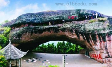 衢州的烂柯山,是《道书》上所说的“青霞第八洞天”,亦名“景华洞天”的所在,是大家所公认的烂柯故事的发源本土。从衢州的小南门出来,走了十六七里路后就可以到石桥的洞下。洞高二十多丈,宽三十余丈,南北深约三五丈,真像是悬空从山间凿出来的一条石桥,不过平常的桥梁,决没有这样高大的桥洞而已。石桥的上面,仍旧是层层的岩石,洞上一层,也有中空的一条石缝,爬上去俯身一看,是可以看得出天来的,所谓一线天者,就系指这一条小缝而言。石桥下南洞口,有一块圆形岩石蹲伏在那里,石的右旁一个八角亭,就是所谓迟日亭。