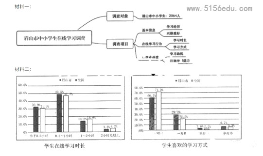 24.眉山市中小学生在线教育测评报告说明 眉山市中小学生在线教育测评以眉山市中小学生为调查对象,调查人数为2064人,调查项目为基本信息在线学习行为和非学业品质三个方面。调查数据显示,与全国中小学生相比,眉山市中小学生1小时之内的在线学习时长略高于全国,而1至2小时及2小时以上均略低于全国。在学生喜欢的学习方式上,眉山学生一对一的方式低于全国10个百分点,一对多,多对一和多对多的学习方式眉山学生均高于全国。 25.作文略