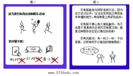 C.材料三图二的内容从三个方面提醒考生:考前不要和同学老师交谈、考前不要心急火燎乱翻书、