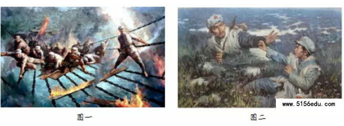 7.图一:飞夺泸定桥;图二:红军过草地。图一事件:1935年5月29日傍晚,以第2连连长廖大珠为突击队长的22名勇士,在火力掩护下,冒着密集的枪弹,攀着桥栏,踏着铁索向对岸冲击。经2小时激战,红4团占领了泸定县城,控制了泸定桥保证红军主力迅速渡过了大渡河。图一理由:这次战役是红军长征中具有战略意义的重大胜利之一。这次胜利体现了红军无限忠于人民革命事业的大无畏精神。图二事件:1935年8月21日,红军开始过草地。理由:在极端恶劣的环境下,红军官兵怀着共同的革命理想,保持着严明的优良纪律和乐观的革命精神,发扬了令人感动的阶级友爱,没有垮掉,没有散掉,同甘共苦,以巨大的精神力量战胜了自然界的困难,终于在死神的威胁下夺路而出。这种精神值得我们敬仰。
